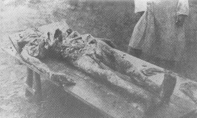 In other places, the victim’s head was placed on an anvil and slowly crushed with a steam hammer. Those due to undergo the same punishment the next day were forced to watch. The eyes of church dignitaries were poked out, their tongues were cut off and they were buried alive. There were Chekists who used to cut open the stomachs of their victims, following which they pulled out a length of the small intestine and nailed it to a telegraph pole and, with a whip, forced the unlucky victim to run circles around the pole until the whole intestine had been unravelled and the victim died. The bishop of Voronezh was boiled alive in a large pot, after which the monks, with revolvers aimed at their heads, were forced to drink this soup.