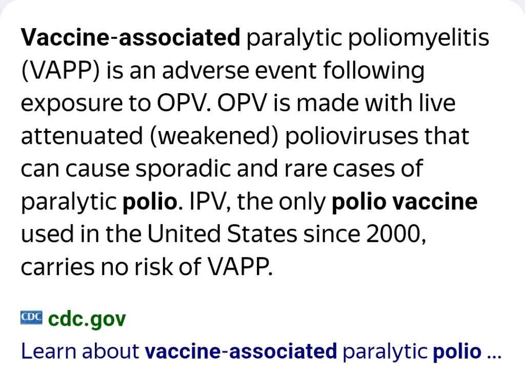 “Vaccine-associated paralytic poliomyelitis (VAPP) is associated with the Oral Polio Vaccine (OPV). This condition occurs when the live weakened virus in the vaccine reverts to a form capable of causing disease, leading to polio symptoms in the vaccinated individual or close contacts.”