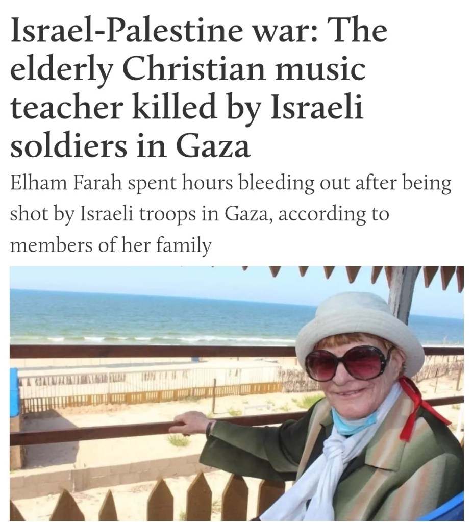 Merciless Zionists monsters kill babies and the elderly. Christian music teacher Ilham Farah, 84, was shot in the leg and bled to death in the streets, unable to get attention in nearby Al Shifa hospital, which was itself under attack.